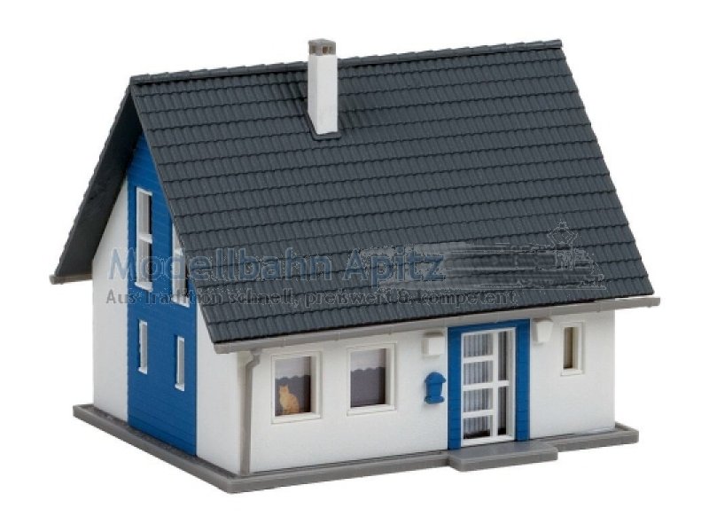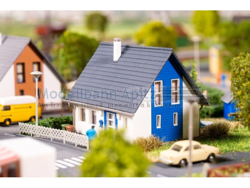 Dieses Einfamilienhaus mit blauen Wandakzenten, großzügiger Terrassen-Bodenplatte und weiteren Ausschmückungsteilen wirkt modern und einladend! Das Modell ist leicht zu bauen und ideal für Einsteiger geeignet.