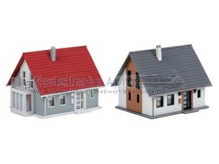 Dieses charmante Doppelpack bringt gleich zwei Einfamilienhäuser auf Ihre Modellbahnanlage: Das erste überzeugt mit hölzernen Wandakzenten, Terrasse und grau geziegeltem Dach. Das zweite Haus setzt mit grauweißer Fassade, eleganter überdachter Terrasse und rotem Ziegeldach weitere moderne Akzente. Beide Modelle sind leicht zu bauen und ideal für Einsteiger geeignet – doppelter Spaß im Miniaturformat!