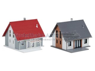 Dieses charmante Doppelpack bringt gleich zwei Einfamilienhäuser auf Ihre Modellbahnanlage: Das erste überzeugt mit hölzernen Wandakzenten, Terrasse und grau geziegeltem Dach. Das zweite Haus setzt mit grauweißer Fassade, eleganter überdachter Terrasse und rotem Ziegeldach weitere moderne Akzente. Beide Modelle sind leicht zu bauen und ideal für Einsteiger geeignet – doppelter Spaß im Miniaturformat!