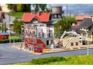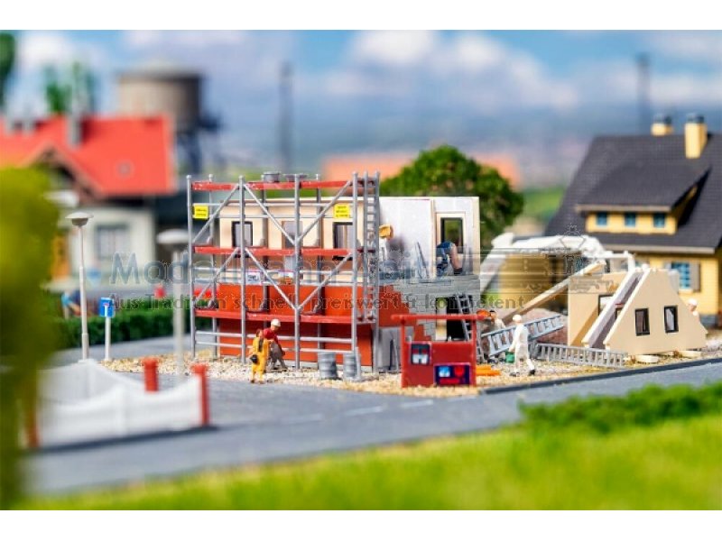 Der Grundstein ist gelegt, das Kellergeschoss steht – und im Erdgeschoss wachsen bereits die ersten Zwischenwände empor. Dieses Modell eines Einfamilienhauses im Bau bringt echtes Baustellenflair auf Ihre Anlage. Mit typischem Zubehör wie Leitern, Baumaterial und Werkzeugen wird die Szene lebendig!