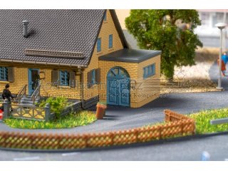Ein helles Klinkerhaus mit eingezäuntem Vorgarten und blauen Fensterläden. Perfekt als Einfamilienhaus für eine Modellfamilie oder um die Vorstadt etwas auszuschmücken.