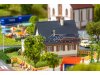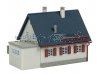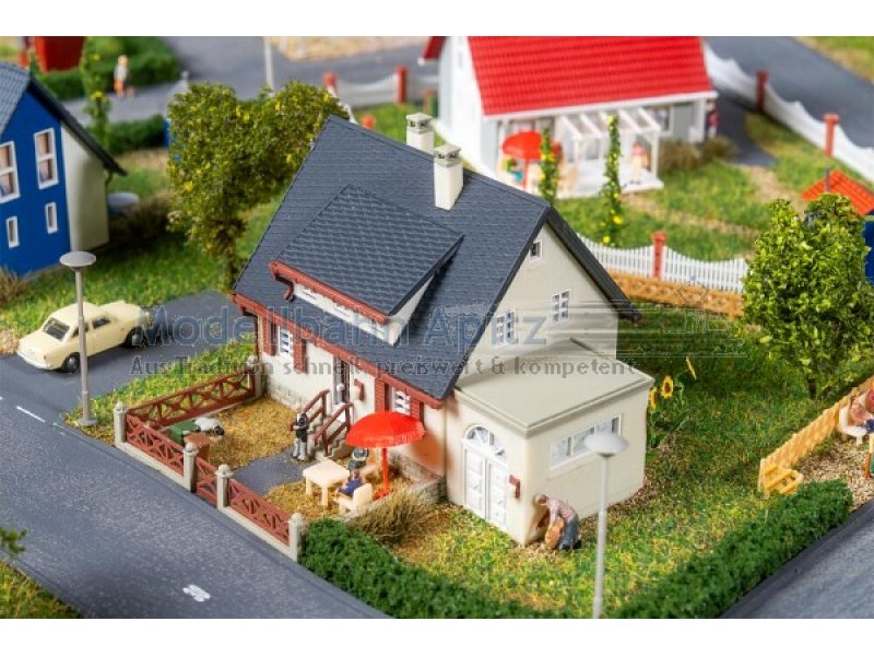 Ein graues Einfamilienhaus mit eingezäuntem Vorgarten und braunen Fensterläden. Perfekt für eine kleine Modellfamilie oder um die Vorstadt etwas auszuschmücken.