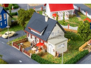 Ein graues Einfamilienhaus mit eingezäuntem Vorgarten und braunen Fensterläden. Perfekt für eine kleine Modellfamilie oder um die Vorstadt etwas auszuschmücken.