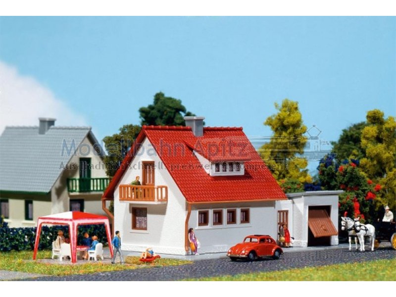 Siedlungshaus mit seitlichem Garagenanbau. |