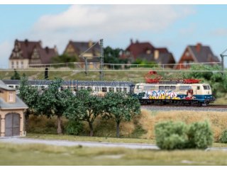 Vorbild: Elektrolokomotive 111 018-0. Achsfolge Bo´Bo´. Baujahr ab 1974. Ausführung mit Zeitgenössischer Kunst. Modell: Gehäuse und Träger aus Zinkdruckguss. Eingebauter Digital-Decoder und Geräuschgenerator zum Betrieb mit mfx und DCC. Motor mit Schwungmasse, 4 Achsen angetrieben, Haftreifen. Stirnbeleuchtung und Schlusslichter mit der Fahrtrichtung wechselnd, mit warmweißen Leuchtdioden, Führerstandsbeleuchtung, digital schaltbar. Kinematik für Kurzkupplung. Länge über Puffer 104 mm.