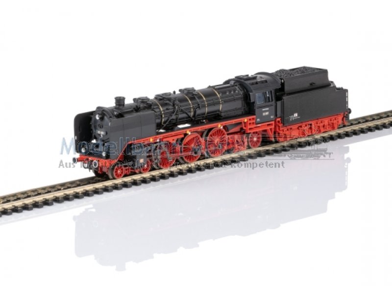 Vorbild: Schnellzug-Dampflokomotive 03 001 mit Kurztender der Bauart 2´2 T30 der Deutschen Bahn AG (DB AG / DB Museum Nürnberg, Leihgabe an die IG Bw Dresden Altstadt e.V). Betriebszustand um 1999. Ausführung mit Altbaukessel, geschlossener Frontschürze und Windleitbleche der Bauart Wagner. Modell: Formvariante. Fahrwerk von Lok und Tender sowie Tenderaufbau aus Metalldruckguss. Eingebauter Digital-Decoder und Geräuschgenerator mit den Formaten mfx und DCC. Antrieb im Tender, 3 Achsen angetrieben, Haftreifen. Feuerbüchsenflackern mittels prozessorgesteuerten Leuchtdioden (rot-orange). 3-Licht-Spitzensignal an der Lok und ein 2-Licht-Spitzensignal am Tender, Führerstandbeleuchtung und Triebwerksbeleuchtung aus warmweißen LED. Kupplungsaufnahme nach NEM am Tenderende. Neukonstruierte Dampfzylinder. Besonderheiten: Zwei unterschiedliche Vorlaufräder mit 7 und 9 Speichen. Länge über Puffer 146 mm.