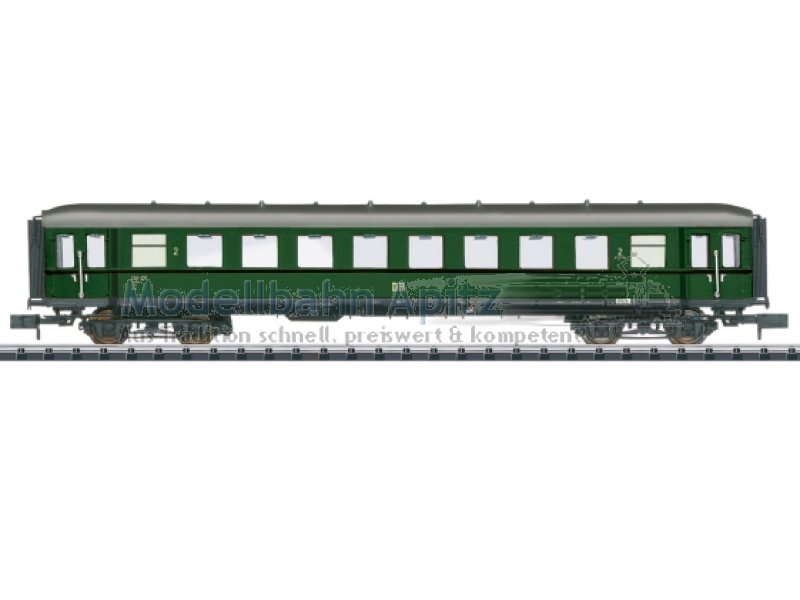 Vorbild: Eilzugwagen 2. Klasse windschnittiger Bauart B4ümpe im Zustand um 1959 der Deutschen Reichsbahn (DR) in flaschengrüner Farbgebung. Modell: Wagen mit Kinematik für Kurzkupplung, mit Drehgestellen in Profileisenausführung. Vorbereitet für den nachträglichen Einbau einer Innenbeleuchtung.Länge über Puffer 134 mm.