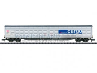 Vorbild: Großraum-Schiebewandwagen Bauart Habbiillns der Schweizerischen Bundesbahnen (SBB). In Ausführung als Wagen der SBB Cargo AG, Basel. Modell: Mit Kinematik für Kurzkupplung. Länge über Puffer 145 mm. |