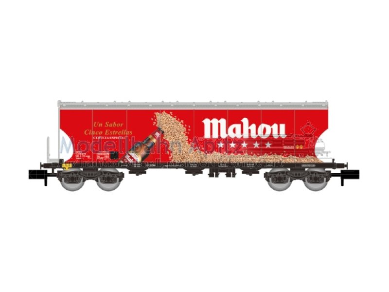 RENFE, 4-achs. Getreidesilowagen mit runden Seitenwänden, äMahou“-Farbgebung |