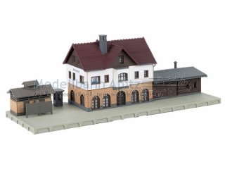 Kleiner charmanter Bahnhof mit Toilettenhäuschen und hölzernem Anbau. Hervorragend geeignet, um eine kleine Stadt mit einem Bahnhof auszustatten. Der Bausatz besteht aus einem Materialmix aus Kunststoff und Holz/Spezialkarton.
