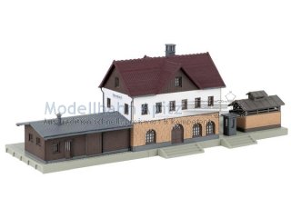 Kleiner charmanter Bahnhof mit Toilettenhäuschen und hölzernem Anbau. Hervorragend geeignet, um eine kleine Stadt mit einem Bahnhof auszustatten. Der Bausatz besteht aus einem Materialmix aus Kunststoff und Holz/Spezialkarton.