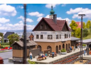 Kleiner charmanter Bahnhof mit Toilettenhäuschen und hölzernem Anbau. Hervorragend geeignet, um eine kleine Stadt mit einem Bahnhof auszustatten. Der Bausatz besteht aus einem Materialmix aus Kunststoff und Holz/Spezialkarton.