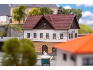 Kleiner charmanter Bahnhof mit Toilettenhäuschen und hölzernem Anbau. Hervorragend geeignet, um eine kleine Stadt mit einem Bahnhof auszustatten. Der Bausatz besteht aus einem Materialmix aus Kunststoff und Holz/Spezialkarton.