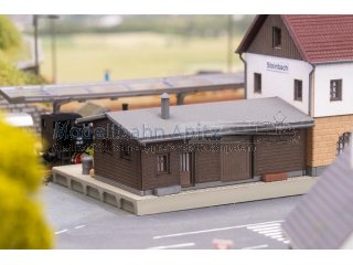 Kleiner charmanter Bahnhof mit Toilettenhäuschen und hölzernem Anbau. Hervorragend geeignet, um eine kleine Stadt mit einem Bahnhof auszustatten. Der Bausatz besteht aus einem Materialmix aus Kunststoff und Holz/Spezialkarton.