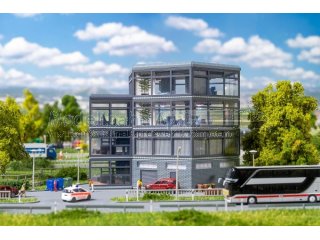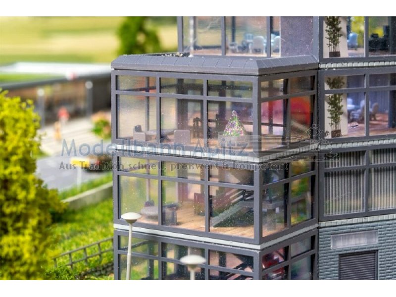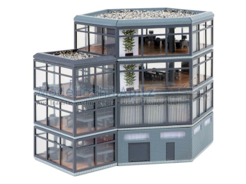 Moderner Bürokomplex mit Charakter! Dieser vierstöckige Bürobau überzeugt mit seiner futuristischen sechseckigen Grundform. Komplett verglast und mit einem dreistöckigen Treppenhaus ergänzt, wirkt die Architektur offen und leicht. Das unterste Stockwerk aus grauen Ziegelsteinen setzt mit seiner Maueroptik einen markanten Kontrast. Perfekt geeignet für jede moderne Stadtlandschaft im Modell.