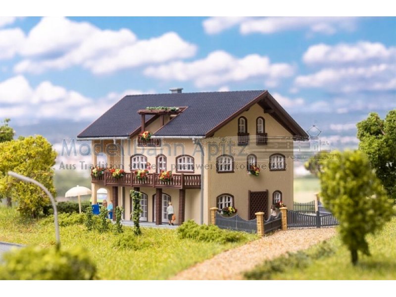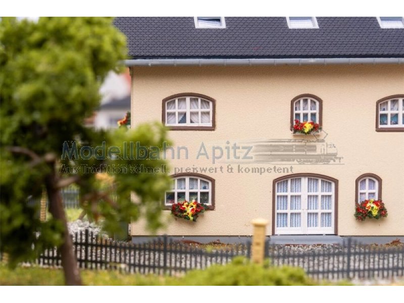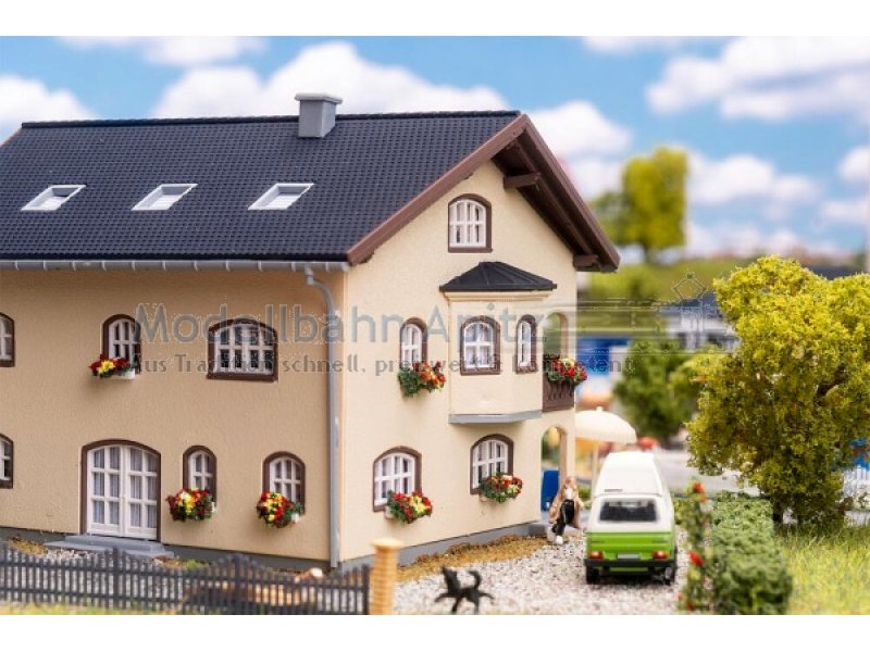 Das helle, moderne Wohnhaus mit Erker, Balkonen, überdachter Terrasse und innenliegendem Dachbalkon sowie bunten Blumenkästen bringt Ruhe und lebendige Details in jede Miniatur-Wohngegend.