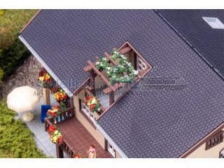 Das helle, moderne Wohnhaus mit Erker, Balkonen, überdachter Terrasse und innenliegendem Dachbalkon sowie bunten Blumenkästen bringt Ruhe und lebendige Details in jede Miniatur-Wohngegend.