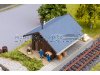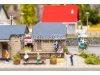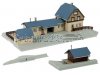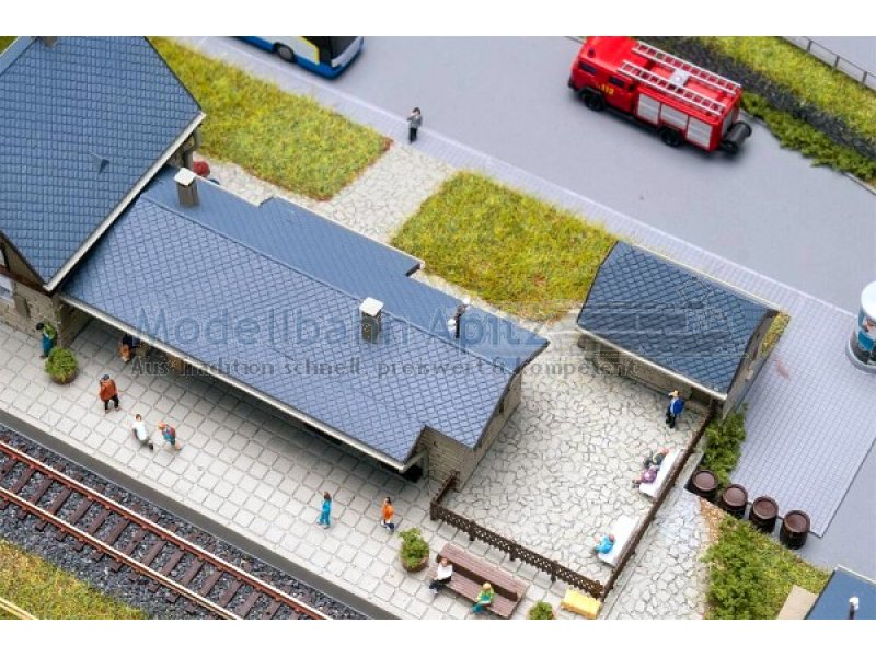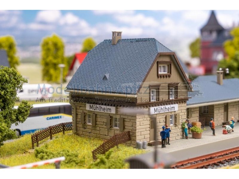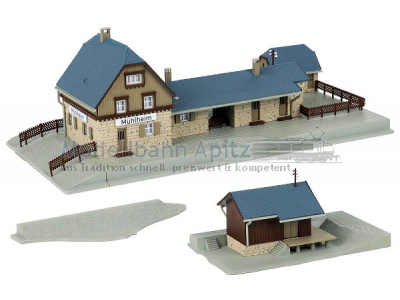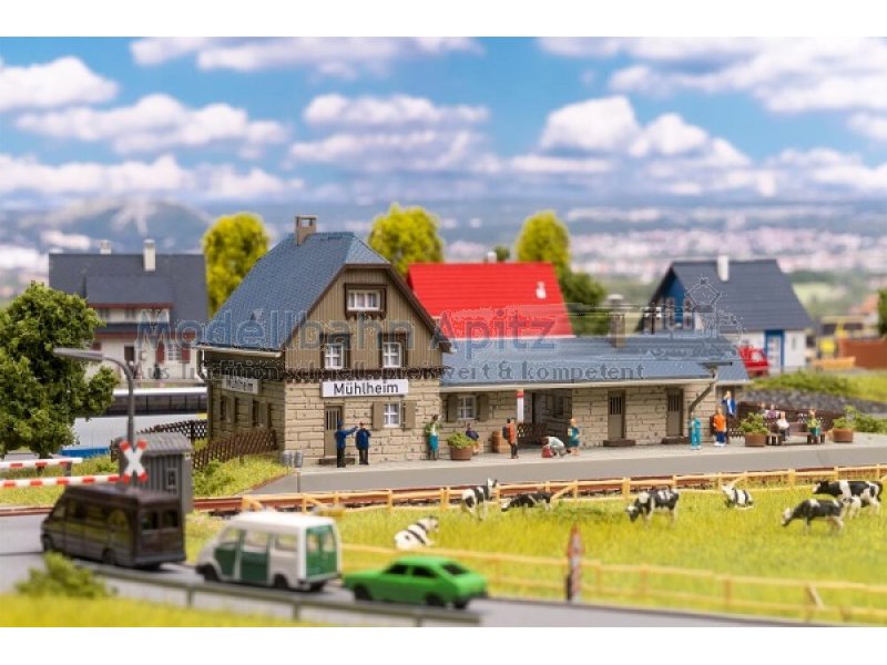 Gemächlich rollt der nächste Zug in den Bahnhof ein und die Miniaturreisenden steigen erwartungsvoll ein. Der Bahnhof Mühlheim mit seinem steinernen Fundament, der hellen Holzfassade und dem grauen Ziegeldach bringt Reisestimmung in die Modellwelt. Ein kleiner hölzerner Lagerschuppen ergänzt das Ensemble.