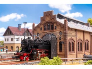 Vielseitig einsetzbar als Lokschuppen, Werkstatt oder Schlosserei – mit Durchfahrtstoren vorne und hinten. Die Modulbauweise lässt eine variable Gebäudeverlängerung und den Bau mehrerer Modelle nebeneinander zu. Kamin vorbereitet für Rauchgeneratoren, für besonders realistische Miniaturszenen.