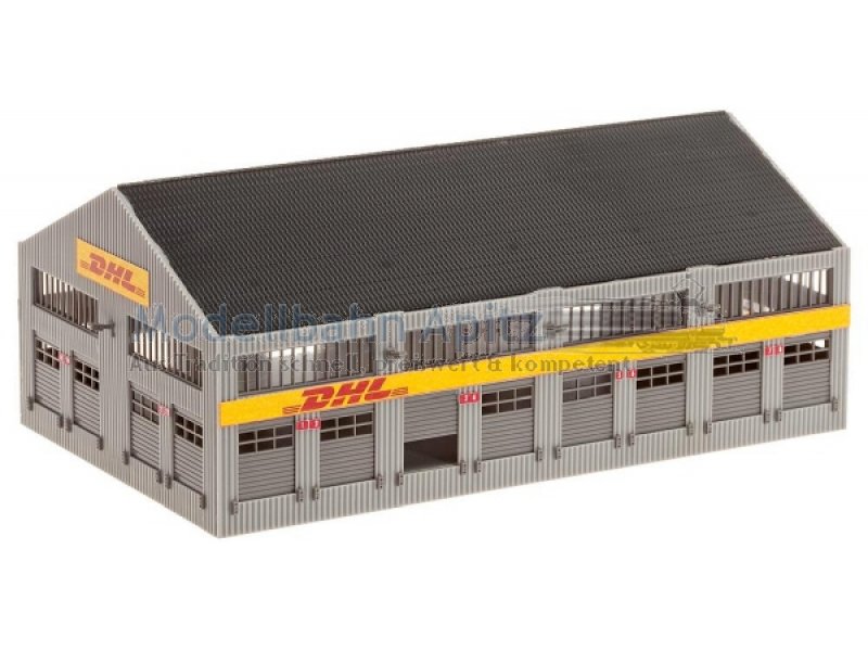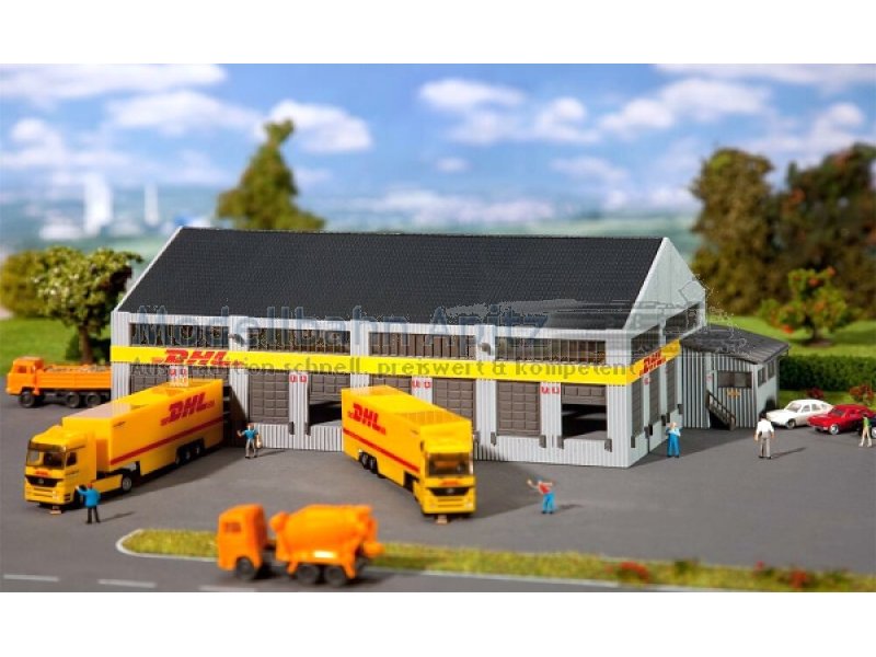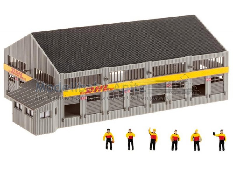 Pakete für die Modellwelt! Diese moderne Frachthalle von DHL ist mit 23 Rolltoren an den Verladerampen und einem seitlich angebauten Bürotrakt ausgestattet. Sie lässt sich flexibel mehrfach hintereinander oder nebeneinander bauen. Ergänzt wird das Ensemble durch sechs detailreiche Paketboten in typischer Arbeitskleidung – beim Zustellen, Grüßen oder mit Paketen in der Hand – welche die Szene beleben.