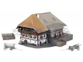 Das Wahrzeichen aus der Region: Ein stattlicher Schwarzwaldhof mit warmem Holzfachwerk, gemauertem Kellergeschoss, Hocheinfahrt sowie Stroh- und Schindeldach. Für die individuelle Gestaltung des Außenbereichs liegen Zäune und Karren bei. Zwei tanzende Figuren in Tracht bringen zusätzlich Leben auf den Hof und in die Modellwelt!