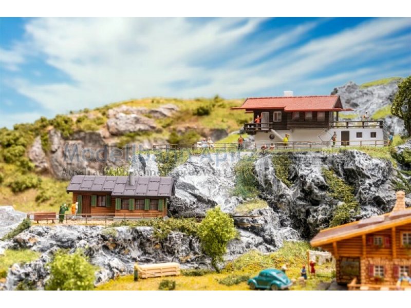 Dieses charmante hölzerne Jägerhaus mit grünen Fensterläden lugt malerisch hinter den Bäumen hervor. In unmittelbarer Nähe steht der liebevoll gestaltete Gasthof mit Terrasse, auf der die Miniaturbesucher gemütlich plaudern können. Zusammen bilden die beiden Modelle ein stimmiges Ensemble für Wald- und Dorfanlagen.