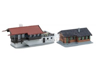 Dieses charmante hölzerne Jägerhaus mit grünen Fensterläden lugt malerisch hinter den Bäumen hervor. In unmittelbarer Nähe steht der liebevoll gestaltete Gasthof mit Terrasse, auf der die Miniaturbesucher gemütlich plaudern können. Zusammen bilden die beiden Modelle ein stimmiges Ensemble für Wald- und Dorfanlagen.