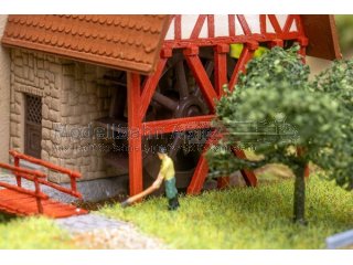 Gemächlich dreht sich das Mühlrad und erfüllt die Luft mit einem sanften Plätschern, während im Inneren fleißig gemahlen wird. Diese charmante Aumühle in hellem Braun mit leuchtend rotem Fachwerk verleiht jeder Dorf- oder Altstadt-Landschaft eine passende Atmosphäre.