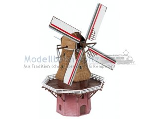 Leise drehen sich die weiß-roten Flügel dieser liebevoll gestalteten Windmühle mit Strohdach und Backsteinsockel – ein charmanter Blickfang für jede Modelllandschaft. Bei diesem Modell können die Flügel durch Einbau des Motors (Art. 180722, max. 5 V, Gleichspannung) realistisch bewegt werden. Der Einbau des Motors kann nur gleichzeitig mit der Bausatzmontage erfolgen. Motor liegt nicht bei.