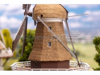 Leise drehen sich die weiß-roten Flügel dieser liebevoll gestalteten Windmühle mit Strohdach und Backsteinsockel – ein charmanter Blickfang für jede Modelllandschaft. Bei diesem Modell können die Flügel durch Einbau des Motors (Art. 180722, max. 5 V, Gleichspannung) realistisch bewegt werden. Der Einbau des Motors kann nur gleichzeitig mit der Bausatzmontage erfolgen. Motor liegt nicht bei.