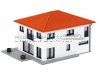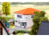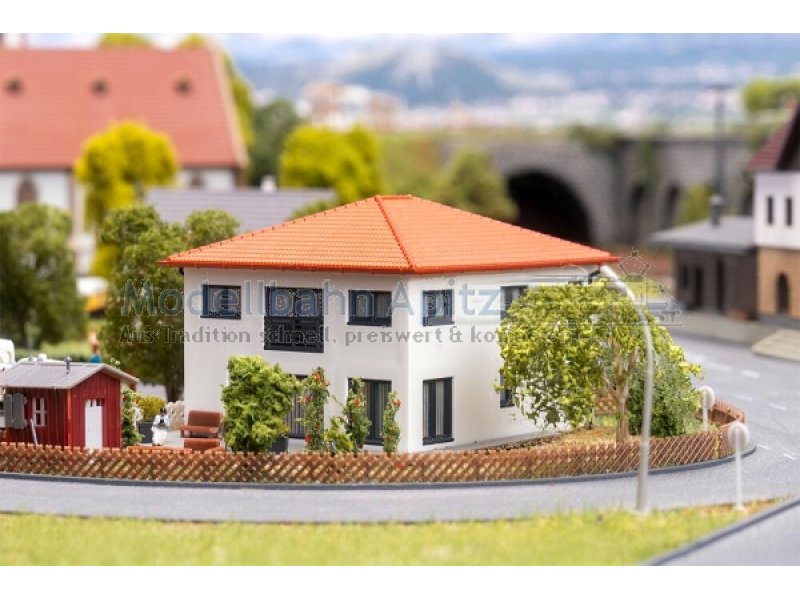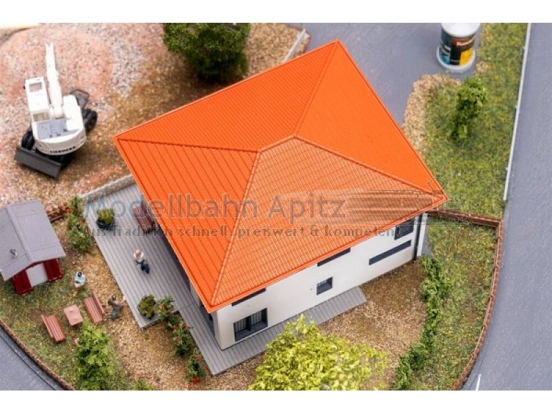 Ein Modell-Haus in modernem, schlichtem Design mit weißer Fassade, warmem orangenem Ziegeldach und markanten schwarzen Fensterrahmen. Hervorragend geeignet, um eine moderne Vorstadt oder eine luxuriöse Wohngegend auszugestalten.