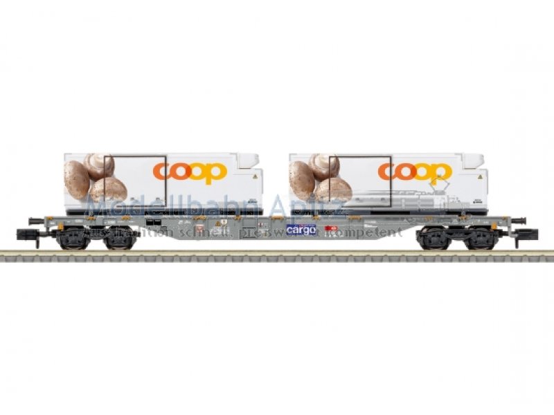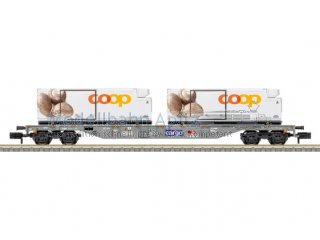Vorbild: vierachsiger Containertragwagen der Bauart Sgns der Schweizerischen Bundesbahn Geschäftsbereich Cargo (SBB Cargo). Beladen mit 2 coop®-Kühlcontainern. Modell: Fahrgestell aus Metalldruckguss, Drehgestelle Typ Y 25, mit Kinematik für Kurzkupplung, beladen mit 2 Kühlcontainern. Länge über Puffer 123 mm.