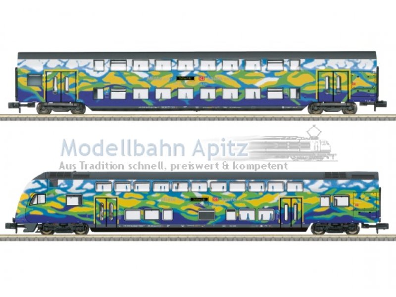 Vorbild: 1 x Doppelstock-Mittelwagen DBpza 753.5 und 1 x Doppelstock-Steuerwagen DBpbzfa 765.6 der DB AG, Geschäftsbereich DB-Gebrauchtzug. Aktueller Zustand der Epoche VI. Modell: Mit eingebauter LED-Innenbeleuchtung, mit beleuchteter Zugzielanzeige über dem Führerstand und Kinematik für Kurzkupplung. Steuerwagen zusätzlich ausgestattet mit Lichtwechsel weiß/rot mittels LED und einem Funktionsdecoder, der auch im Analogbetrieb funktionsfähig ist. Gesamtlänge über Puffer 334 mm.