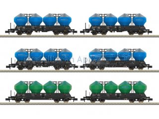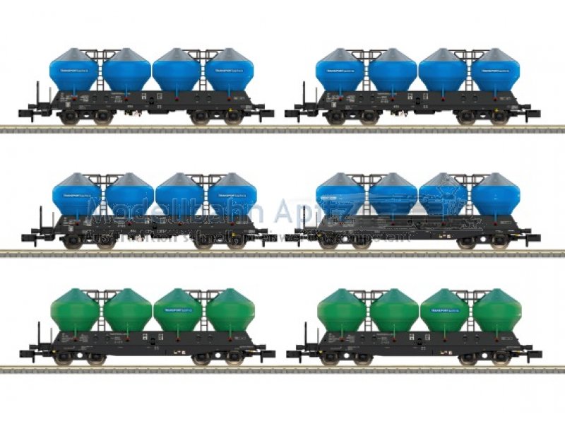 Vorbild: 6 vierachsige Silowagen der Bauart Uacs der Bahngesellschaft TRANSPORTSERVIS a.s. in Tschechien. 3 Silowagen in der Ausführung mit geradem Langträger und 3 Silowagen in der Ausführung mit Schürze. 4 Wagen mit blauen und 2 Wagen mit grünen Behältern. Betriebszustand um 2011. Modell: Mit Kinematik für Kurzkupplung. Gesamtlänge über Puffer 546 mm.