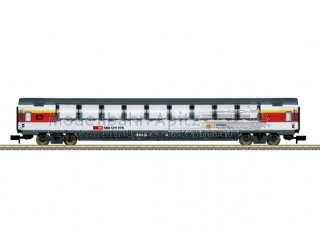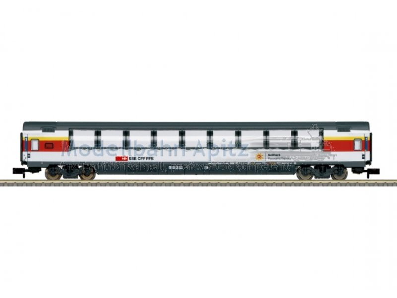 Vorbild: Schnellzugwagen Typ SRm der Schweizerischen Bundesbahnen (SBB/CFF/FFS). Großraumwagen mit hohen Aussichtsfenstern bis in die Dachfläche. Aktueller Einsatz: Internationale Fernzüge. Modell: Kinematik für Kurzkupplung. Länge über Puffer 165 mm.