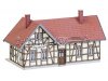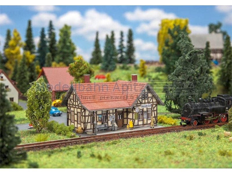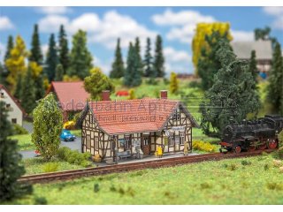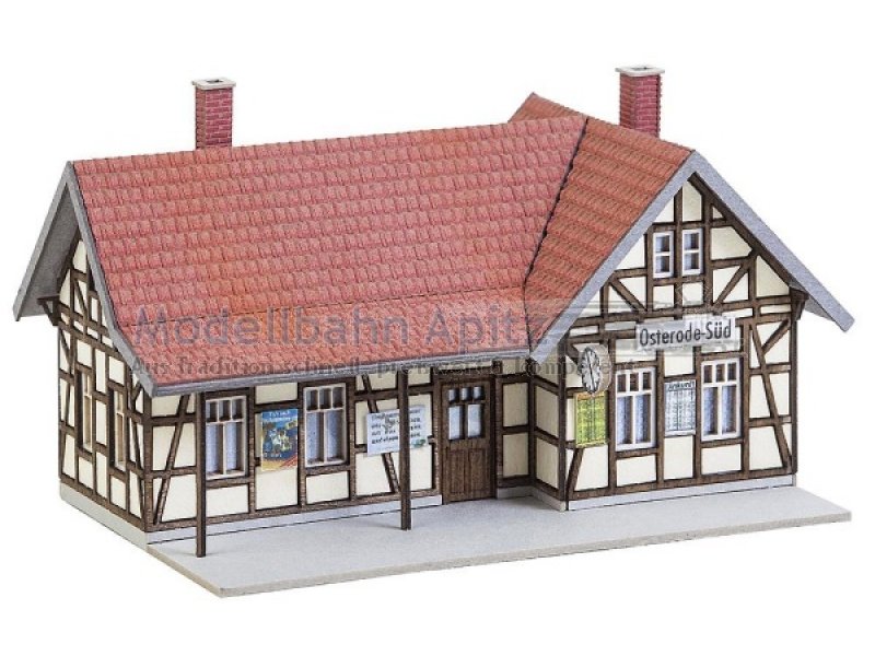 Lasercut-Modell nach dem Originalvorbild des ehemaligen Osteroder Suedbahnhofs im Harz. Zur Gleisseite bietet der eingeschossige Fachwerkbau den Reisenden eine Wartemoeglichkeit unter einem Vordach. |
