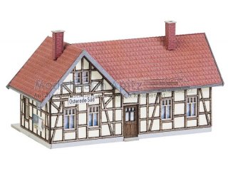 Lasercut-Modell nach dem Originalvorbild des ehemaligen Osteroder Suedbahnhofs im Harz. Zur Gleisseite bietet der eingeschossige Fachwerkbau den Reisenden eine Wartemoeglichkeit unter einem Vordach.