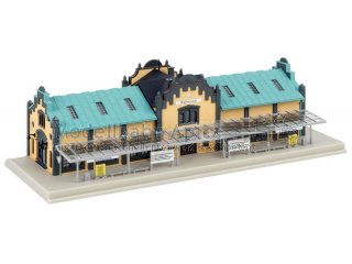 Dieses Modell fängt den Charme der Jahrhundertwende ein: hell-türkises Dach, helle gelbe Steinfassade und eine verglaste Bahnsteigüberdachung auf der Bahnseite verleihen dem Bahnhof Charakter. Die klare Klinkerbauweise und liebevolle Details machen ihn zu einem stimmungsvollen Mittelpunkt jeder Anlage. Das Modell ist architektonisch eigenständig und hat keinen Bezug zum Originalbahnhof in Rathenow (Brandenburg).