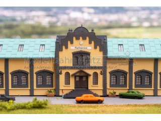 Dieses Modell fängt den Charme der Jahrhundertwende ein: hell-türkises Dach, helle gelbe Steinfassade und eine verglaste Bahnsteigüberdachung auf der Bahnseite verleihen dem Bahnhof Charakter. Die klare Klinkerbauweise und liebevolle Details machen ihn zu einem stimmungsvollen Mittelpunkt jeder Anlage. Das Modell ist architektonisch eigenständig und hat keinen Bezug zum Originalbahnhof in Rathenow (Brandenburg).