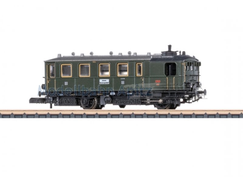 Vorbild: Dampftriebwagen Bauart Kittel CidT der Großherzoglich Badischen Staatsbahn (G. Bad. Sts. B.). Betriebszustand 1915. Ausführung der Original-Lackierung in flaschengrün. Modell: Modell mit Glockenankermotor, fein detailliert, Fahrwerk aus Metall. Viele Ansetzteile. Vergrößerte Pufferteller. Hinten mit Systemkupplung ausgerüstet. Vorne mit vorbildgetreuer Nachbildung der Pufferbohle. 2-Licht-Spitzensignal mit warmweißen Leuchtdioden (LED) mit der Fahrtrichtung wechselnd. Beide Achsen angetrieben.Länge über Puffer ca. 51 mm.