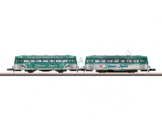 Vorbild: Motorwagen BR 798 und Beiwagen BR 998 der DB Regio (DB AG) in der Gestaltung als Ulmer Spatz der Epoche VI um 2008. Modell: Ausgerüstet mit Glockenankermotor. Hochfeine Bedruckung des Motor- und Beiwagens u. a. mit den Türgummis der Falttüren, gedruckten Lampenringen etc. Vorbildgerechte Puffernachbildungen. Inneneinrichtung, LED-Innenbeleuchtung, Räder mit dunkel vernickelten Laufkränzen. Länge über Puffer ca. 128 mm.