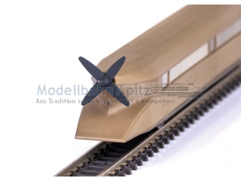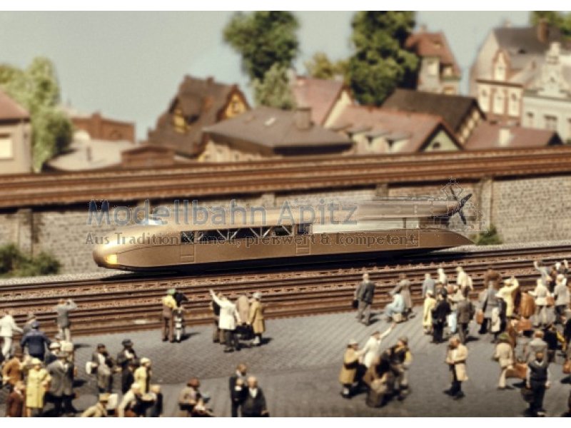 Vorbild: Propellertriebwagen der Bauart Kruckenberg. Modell: Technisch überarbeitetes Modell ausgerüstet mit Glockenankermotor. Gehäuse aus Echtbronze in Handarbeit gegossen. LED-Zweilicht-Spitzensignal vorn. Dunkle Radkränze, vordere Achse angetrieben, ebenso wie der Propeller. Das Modell kommt in einer edlen Holzverpackung und mit Echtheitszertifikat. Länge über Puffer 117 mm.