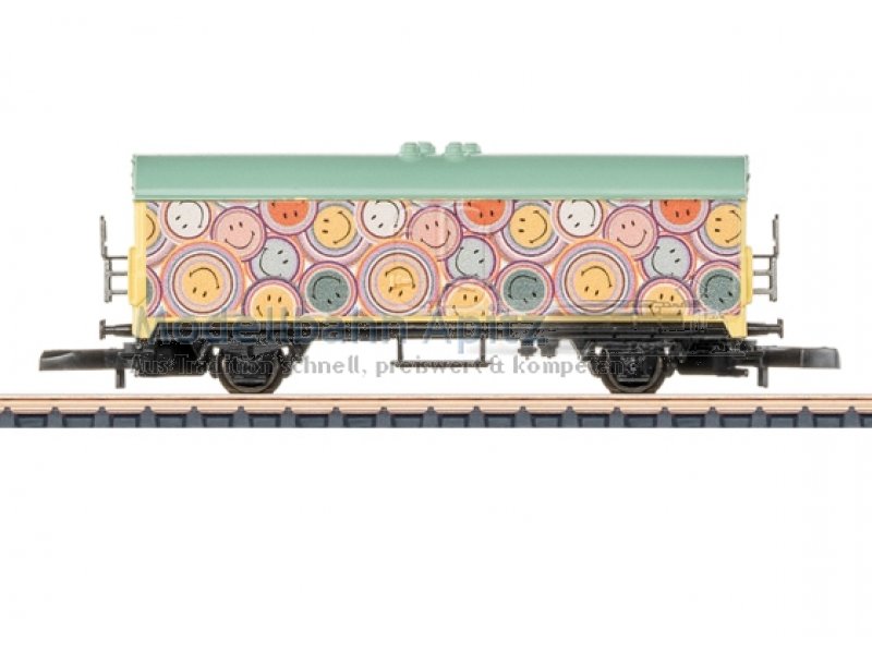 Vorbild: Zweiachsiger Kühlwagen (Tehs 50). Modell: Zweite Auflage eines SmileyWorld® Wagen in Märklin Z. Aufwendige Farbgebung. Scheibenradsätze schwarz vernickelt, angesetzte Bühnen aus Metall.Länge über Puffer 54 mm.