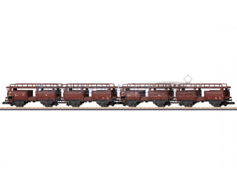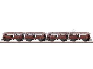 Vorbild: 2 Wagenpaare (Doppeleinheit) Bauart Laae 540, der Deutschen Bundesbahn (DB) im Zustand der Epoche IV. Modell: Set Inhalt 2 Wagenpaare. Je 2 Wagen bilden eine dem Vorbild entsprechend, fest gekuppelte Doppeleinheit. Angedeutete Überfahrbleche. Bühne aus Kunststoff, für gängige PKW Modelle aus dem Märklin Programm. Gesamtlänge ca. 186 mm. Modelle einzeln nicht erhältlich.