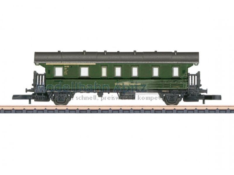 2-achsiger Behelfs-Gepäckwagen als Pwghs, auf Basis einer Donnerbüchse BCi-29, 1./2. Klasse, der Deutschen Bundesbahn (DB). Betriebszustand der Ep. III. Modell: Modell mit feiner Bedruckung, Wagenboden mit Anschriften. Länge über Puffer 63 mm.
