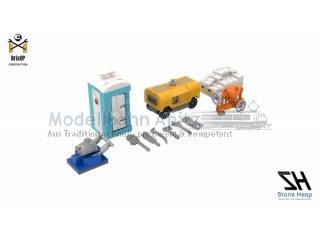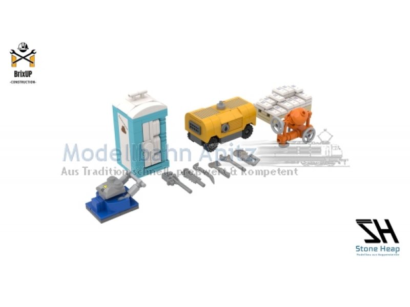 Das Baustellenzubehör-Set enthält alles, was auf einer Baustelle nicht fehlen darf: Mobile Toiletten, Werkzeug, Ziegelsteine, Eimer, und Schaufeln. Ideal, um deine Baustelle mit authentischen Details auszustatten